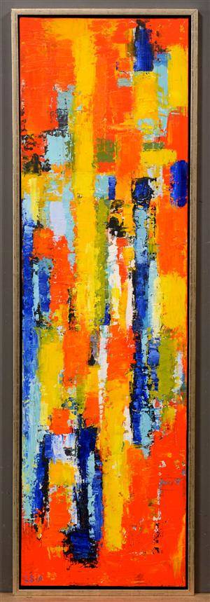 'Komposition Lambda' af Lene Schmidt-Petersen (f. 1950), akryl på lærred, signeret LS-P samt betitlet, signeret og dateret på bagsiden: 'Komposition Lambda', Lene Schmidt-Petersen. 120 x 35 cm. (124 x 39 cm). Læs kunstnerprofil her