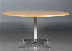 Charles Eames 1907-1978. Rundt bord. Stel med firpasfod i forkromet aluminium/hvidlakeret stål, senere plade fra Vitra af ahorn. Fremstillet hos Vitra. H. 71,5 cm. Ø. 140 cm. Fremstår med brugsspor og få trykmærker på bordpladen.