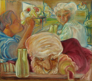 William Louis Sørensen. "Kompositionsstudie". Figursceneri i bar. Olie på lærred. Sign. monogram samt dateret Sep 62. 80 x 92 cm. (82 x 94 cm.) Hidrørende fra kunstnerens dødsbo. William Louis Sørensen entrede kunstscenen i 1960ernes slutning som en del af den såkaldte Århus Avantgarde, et livligt og eksperimenterende kunstnerisk miljø, hvor kunstarterne og genrerne blandedes. Outsiderpositionen og den stadige bevægelse mod nye formundersøgelser samt fluxusinspirationen viste sig at være et karakteristisk træk ved S.' kunst. Han har ubesværet bevæget sig mellem genrer som mail-art, lyd- og luftskulpturer, bogprojekter, lyrik, komposition, publikumsinddragende koncerter, installation, video, computergenererede billeder samt hybrider mellem alle disse former. For en række af områderne er S., i lighed med f.eks. Eric Andersen, pioner internationalt som nationalt. Begyndelsen af 1970erne bragte S. til Spanien og senere Afrika. Fra 1980ernes midte har S. vendt interessen mod udstillings