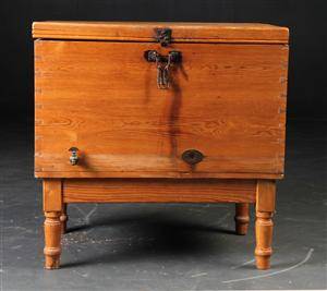Isskab af massiv fyrretræ, åbnes i top, indvendigt foret med zink, front med tappehane, 1900-tallets første halvdel. H. 64 B. 64 D. 46 cm. Fremstår med brugsspor.