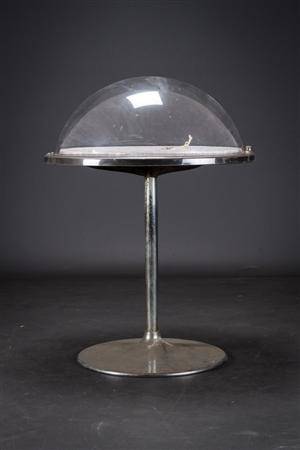 Udstillingsmontre på trompetfod af patineret metal, halvkuppel af akryl. H. 95 Ø 73 cm. Lås og nøgle medfølger