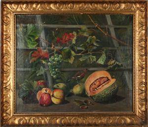 Opstilling med fugl, frugt og vinplante af Ubekendt kunstner 18/1900-tallet, olie på lærred. Sign. monogram F.H samt svagt dateret. 46 x 55 cm (58 x 67).