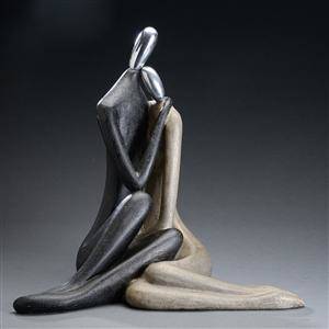 Skulptur af støbt kunstmateriale og poleret aluminium, forestillende siddende mand og kvinde. H. 57 cm.