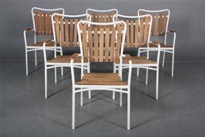 Havemøbler. Seks armstole/stabelstole med stel af pulverlakeret modehvid aluminium, ergonomisk sæde og ryg af knastfrit plantage teak. Stole: H. 92. B. 56. Sædehøjde: 45 cm. Designet af DaneLine designteam, mærke herfra. 2. sortering. Trykmærker og diverse håndteringsspor kan forekomme. (6)