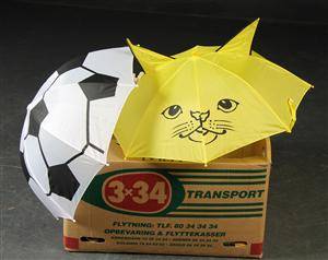 Parti med ca. 40 børne paraplyer / solparasoller med påtrykt motiv i form af bl.a. fodbord-tern, kattehoved med ører mm. Vejlende udsalgspris ca. 2000 kr.Nyproducerede varer vurderes efter nyvareprincippet. Det betyder, at vurderingen plus købersalær svarer til den vejledende udsalgspris eller til hvad varen vil koste i en butik. Se mere her.