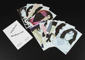 Andy Warhol 1928-87. Mini-folio med 10 originale screenprints med portrætter af Mick Jagger. Udgivet af Multiples Inc. / Castelli Graphics 1975 i forbindelse med Warhol's portræt af Mick Jagger. Dette eksemplar er en del af den første produktion der blev trykt uden kunstnernes signatur. Hvert print måler 15,5 x 10,3 cm. Andy Warhols familie emigrerede fra Slovakiet. Han viste tidligt tegn på kunstnerisk talent og uddannede sig til reklametegner ved Carnegie Institute i Pittsburgh, USA. Han flyttede til New York i 1949, hvor han skabte sig et navn indenfor tegnekunst og reklame. Warhol blev en kendt figur i New Yorks glamourøse miljø, hvor han frekventerede kendte natklubber såsom Studio 54. Han var åbenlyst homoseksuel, noget som var særdeles usædvanligt for mediepersonligheder i 1960'erne. Warhol blev en celebritet på linje med underholdningsindustriens største stjerner, og i lighed med den samtidige Joseph Beuys i Europa kan det ofte være vanskeligt at skille kunst og personlighed