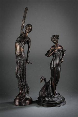 Skulpturer af patineret bronze i form af charleston pige H. 47 cm. og kvinde med svane H. 38 cm. Vægt i alt 3587 gr. (2)