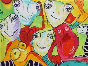 Elsabeth Kloster Palm, Danmark, akryl på duk, figurkomposition, "Hejsa", 70x90 cm, signerad, betitlad.