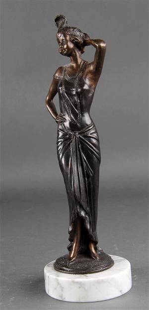 Skulptur i form af kvinde i kjole med diadem, udført i patineret bronze på sokkel af marmor. H. 33 cm. Vægt 1,5 kg. Nyproducerede varer vurderes efter nyvareprincippet. Det betyder, at vurderingen plus købersalær svarer til den vejledende udsalgspris eller til hvad varen vil koste i en butik. Se mere her.