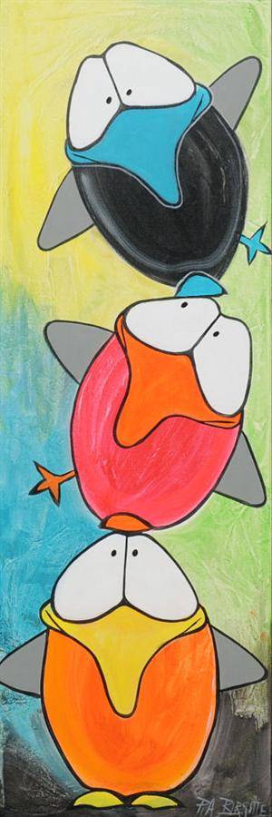 Figurkomposition af Pia Birgitte Stenderup (f. 1968), akryl på lærred, signeret Pia Birgitte. U.R. 120 x 40 cm.