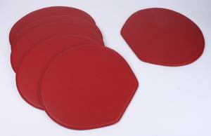 Sæt på seks løse hynder til Arne Jacobsens 7'er stole. Betrykket med dyb rødlæder,bagside med antiskrid. Fremstår nye og ubrugte.(6)