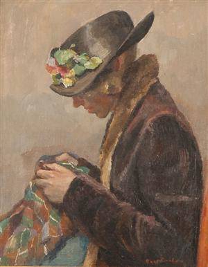 Carl Fischer. En broderende kvinde, olie på lærred monteret på plade, cd