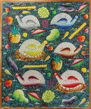 Sign. Edouard Gerard 20. årh.: Komposition med fugle. Edouard Yves Jh. Gerard 28/3/84 Haiti. Olie på lærred. 152 x 126 (154 x 128) cm. Lærred fremstår med rift ved kant foroven.