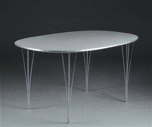 Piet Hein & Bruno Mathsson. Elipse bord, plade af hvid laminat, monteret med spændben af forkromet stålrør. Fremstillet hos Fritz Hansen. H. 71, L. 135 B. 90 cm. Fremstår med alm. brugsspor, små ridser samt enkelt trykmærke ved kantliste.