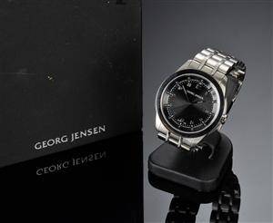 Georg Jensen, "Vice", herrearmbåndsur i urkasse af stål med mørk urskive med logo, arabertal, tre visere, minutmarkeringer samt datoangivelse. Uret har schweizisk quartzværk samt integreret lænke i stål med foldespænde. Ø: 40 mm (ekskl. krone). Uret kommer med folie på bagkassen samt original Georg Jensen boks. Design nr. 388 - Nicolas Barth Nussbaumer. Uret fungerer, men Lauritz.com indestår ikke for funktionaliteten.