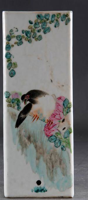 Kinesisk vase 19/20 Årh. prydet med fugl og kinesiske skrifttegn, den ene side med mindre bordet hul , signeret i bunden, H. 28 cm.