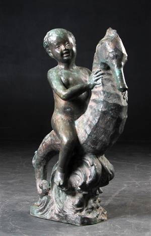 Skulptur af grønpatineret bronze i form af dreng på søhest. H. 80 x 60 cm Vægt 29,2 kg.Nyproducerede varer vurderes efter nyvareprincippet. Det betyder, at vurderingen plus købersalær svarer til den vejledende udsalgspris eller til hvad varen vil koste i en butik. Se mere her.