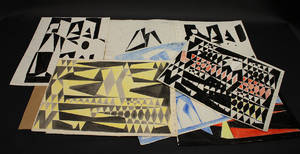 Bertil Öhlund (1923-2003), skisser på papper, 8 st. Signerade Bertil Öhlund och daterade -55 respektive -56. Geometriska kompositioner. Storlek ca 45 x 32 vardera.Detta verk ingår som en del av kvarlåtenskapen efter konstnärsparet Bertil Öhlund och Yvonne Antoniou-Öhlund. Verket har hittills endast varit i familjens ägo och är därför inte belagt med BUS.
