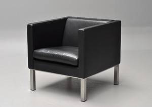 Erik Jørgensen. Lænestol, model EJ 50-1 polstret med sort læder, fast betræk på stel, aftageligt på pude, pude med koldskum og duntop, stel i matkrom. L. 69 cm. To trykmærker i ryg.