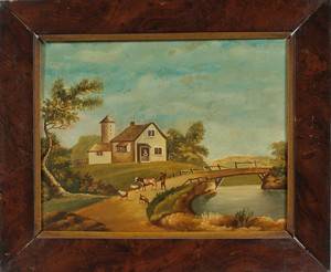 Avslutade auktioner liknande Lanskapsmotiv med hus, olja på pannå, omkring 1900
