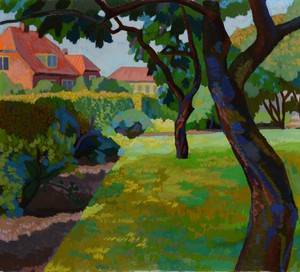 Komposition med hus og have, af ubekendt kunstner. Olie på lærred, sign. og dat. B.H.1959. 76 x 84 cm. UR