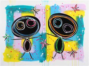 Finn Findus (f. 1965): Abstrakt komposition med figurer. A love of Life. Akryl på lærred. Sign. Findus. Verso betegnet samt signeret: Finn Findus. Mål: 100 Läs mer...