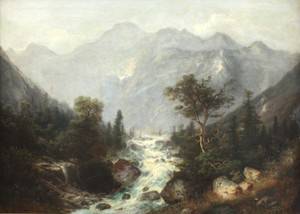 Th. Hakonsen, start 1800-tallet. Olie på lærred. Landskabsparti med fossende elv. Sign. Hakonsen. Mål: 72 x 100 cm, (90x120). Fremstår med små reparationer samt par små afskalninger. Lærred opspændt på nyere blændramme.