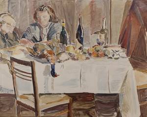 Ubekendt kunstner. Interiør med mor og søn ved spisebordet