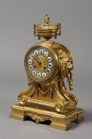 Fransk kaminur af forgyldt zink med glaskuppel. Uret rigt støbt med figur, lam, bladværk; nederst rocaille og svungne ben. Hvidemaljeret urskive med romertal. Pendul og Läs mer...