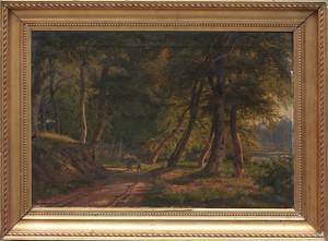 Ubekendt kunstner, olie på lærred. Skovparti med ældre kone og dreng der sanker brænde, signeret med monogram CH og dateret 1864. H. 47 x 69 cm (63 x 85 cm) Mærker fra blændramme i lærred.