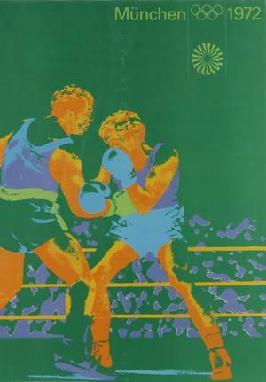 Plakat fra OL 1972 i München efter foto af Otto Hesse, trykt hos Mandruck i München. 85 x 59 cm. Enkelte folder øver langs midten af plakaten.