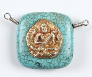 Vedhæng med kvadratisk turkis prydet med Buddhafigur af forgyldt metal, montage af sterling sølv. 35 x 35 mmNyproducerede varer vurderes efter nyvareprincippet. Det betyder, at vurderingen plus købersalær svarer til den vejledende udsalgspris eller til hvad varen vil koste i en butik. Se mere her.