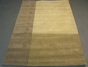 Modeerne håndtuftet tæppe udført af uld på bomuldstrend. Monteret med bomuld på bagside. Gullig-grønne nuancer med beige samt garner. Mål ca. 155 x 245 cm. Läs mer...