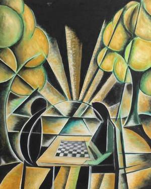 'Schack' komposition av Johan Rydholm, (f. 1980). Olja på duk. Signerad A Tergo. Bildmått: 61x50 cm. Oramad.