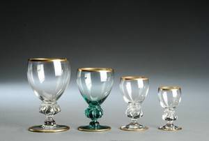 Holmegaard. Gisselfeldt, glas med guldkant best. af; 11 rød H. 13 cm.; 7 hvid H. 12 cm.; 6 øl H. 12,5 cm.; 11 hedvin H. Läs mer...