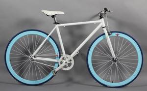 Fixiebike blå/hvidlakeret. Stel i stål. Cykel med fast gear (fixie) er et udtryk for en cykel, der har et fast cykelnav, hvilket betyder at pedalerne altid drejer hvis hjulet drejer, hvilket igen betyder at en cykel med fast gear ikke har friløb. Bemærk: Hvis cyklen ikke er monteret med 2 adskilte bremsesystemer, er den ulovlig at bruge i trafikken. L: 166 cm. Stangmål :74 cm. Udstillingsmodel. Modelfoto. Nyproducerede varer vurderes efter nyvareprincippet. Det betyder, at vurderingen plus købersalær svarer til den vejledende udsalgspris eller til hvad varen vil koste i en butik. Se mere her.