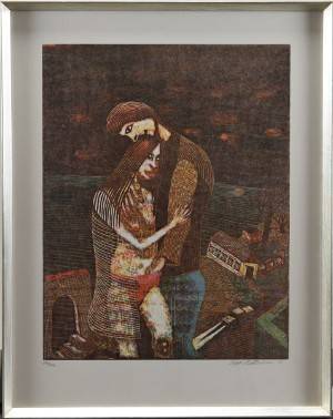 Seppo Mattinen (f. 1930), CD. Figurkomposition. Træsnit i farver. Sign. Seppo Mattinen 75, 1539/1895. 55 x 44 cm. (69 x 56 cm.). Palle Nielsen (1920-2000), Läs mer...