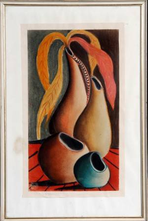 Ubekendt dansk kunstner. Pastelkridttegning. Opstilling med vaser og plante. Signeret på både tegning og montering. Lysmål: 49 x 29 cm. Fra 1930´erne.