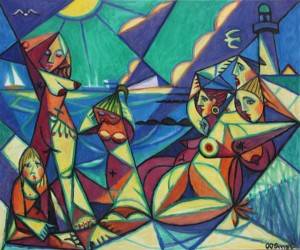 Ole Otto Ernst (f. 1949). Solbadende kvinder på stranden, kubistisk komposition, olie på lærred, sign. OOErnst. 120 x 150 cm. (125 x 155 cm.) Läs mer...