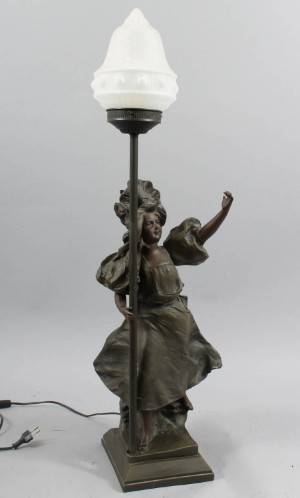 Bordsarmatur, jugendstil, 19/2000-tal. Gjutmassa. Motiv av kvinna. Höjd 79 cm. Signerad enligt bild.