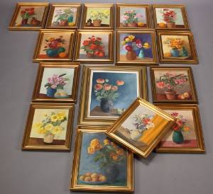 Blomsterkompositioner af Fr. Bertelsen, olie på lærred. Sign. Rammemål 34 x 44 - 69 x 58 cm. Enkelte med reparationer. (16)