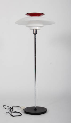 Poul Henningsen. 1894-1967. Standerlampe PH 80 med mellem og underskærm af opal akryl, top af rød/sort kunststof, forkromet stamme på sort fodstykke. Fremstillet hos Louis Poulsen. H. 131 cm. Fremstår med ekstra monteret lysdæmper.