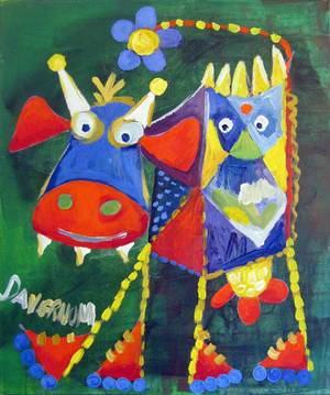 Niels Davernum f. 1958. Komposition med køer. Akryl på lærred. Sign. Davernum, Mål: 60 x 50 cm. UR