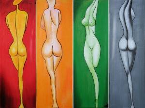 Ubekendt kunstner, 2000-tallet. Fire-delt maleri. Akryl på lærred. Motiv med kvindefigurer. Usigneret. Mål hver: 90 x 30 cm. UR. Fire stk. (4) Nyproducerede varer vurderes efter nyvareprincippet. Det betyder, at vurderingen plus købersalær svarer til den vejledende udsalgspris eller til hvad varen vil koste i en butik. Se mere her.