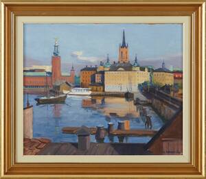 GUNNAR ZETTERSTRÖM (1902-1965): Utsikt mot Stadshuset och Riddarkyrkan, signerad G Zetterström, olja på pannå, 38x46 cm. 314975.