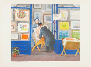 LENNART JIRLOW (född 1936): "Konsthandeln/Le Marchand d´Estampes", signerad L. Jirlow, 1975, numrerad 275/380, färglitografi, Arches, 45,5x55 cm, . Oramad, gulnader.