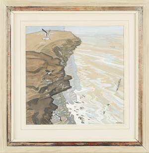 ROLAND SVENSSON (1910-2003): Kustlandskap med sjöfågel, signerad Roland S, gouache, ca 30 x 30 cm. 343897.
