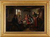 DANSK SKOLA (1800-tal): Interiör med sällskap, osignerad, påskrift på spännramen "Hans Kofoed", olja på duk, 74,5 x 108 cm