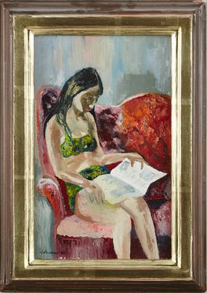HARRY WICHMANN (1916-1993): "Flicka i soffa", signerad och daterad Wichmann 60, olja på pannå, ca 20 x 13 cm. 322498.