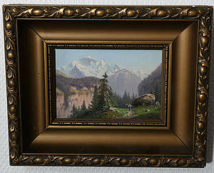 Avslutade auktioner liknande OIDENTIFIERAD KONSTNÄR. Olja på pannå, Alplandskap, monogramsignerad, 1800-tal.